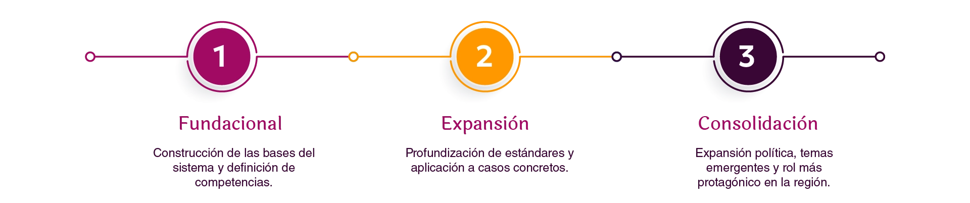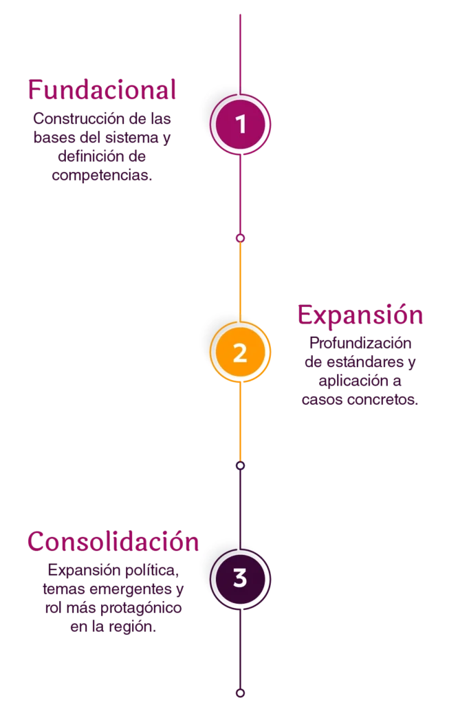 La evolución de las Opiniones Consultivas de la Corte Interamericana de Derechos Humanos puede leerse como un proceso progresivo de construcción institucional, desarrollo doctrinal y expansión política. Dividirlas en tres etapas no responde a una clasificación formal de la Corte, sino a una lectura analítica que permite entender cómo ha cambiado su rol en la región a lo largo del tiempo. Esta periodización ayuda a identificar no sólo qué dice la Corte, sino cómo y para qué lo dice en distintos momentos históricos.